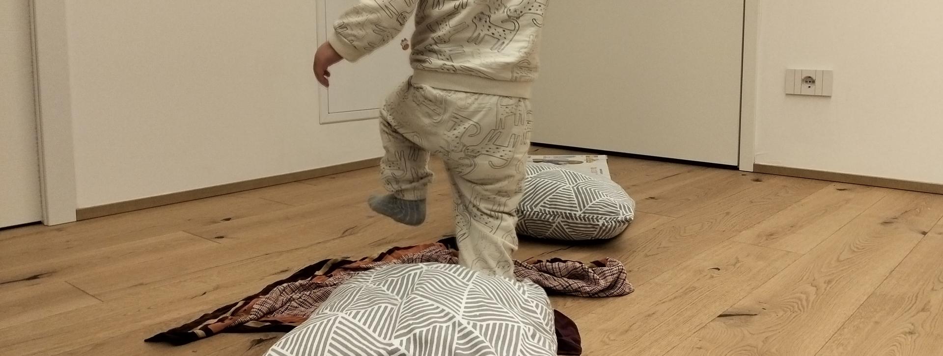 Preparate un percorso utilizzando cuscini e tappeti sovrapposti per formare un “ponte” da attraversare. Aggiungete scatole qua e là, come piccoli ostacoli che il bambino potrà saltare, scavalcare o aggirare. - Attraversare il ponte: